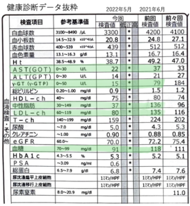 断酒前は、食事や運動などで改善する努力はしていたものの、健康診断の複数項目で基準値外*がある状況でした。それが断酒から約11ヶ月後の健康診断では、全ての項目の数値が正常範囲になりALL A判定にすることができたのです!