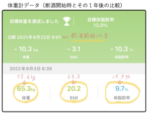 お酒やめたら体重・体脂肪率・BMIを大幅に下げることができました。