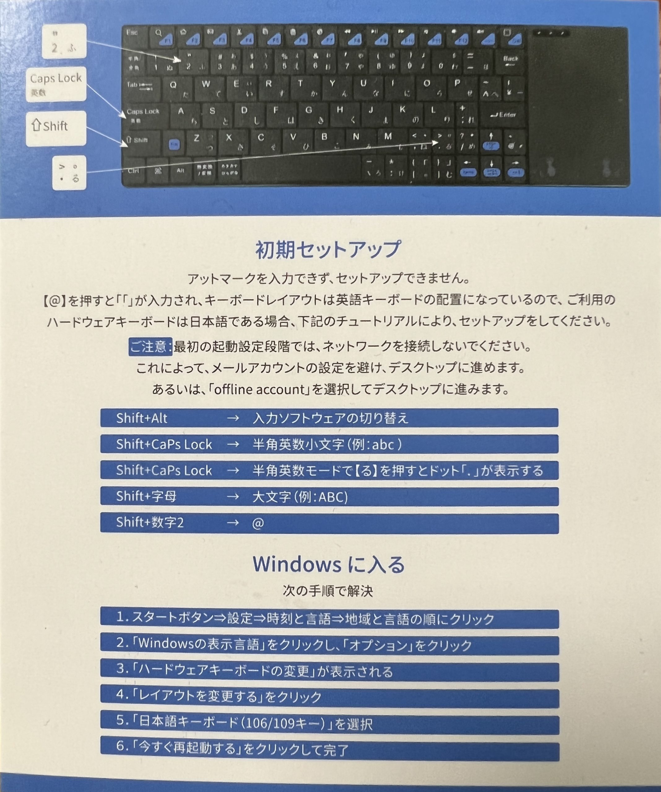 順調に起動しました。初期セットアップセットをして、キーボードのデフォルト設定がUSキーボードになっているので、手順書に沿って日本語109キーボードを選択してセットアップします。