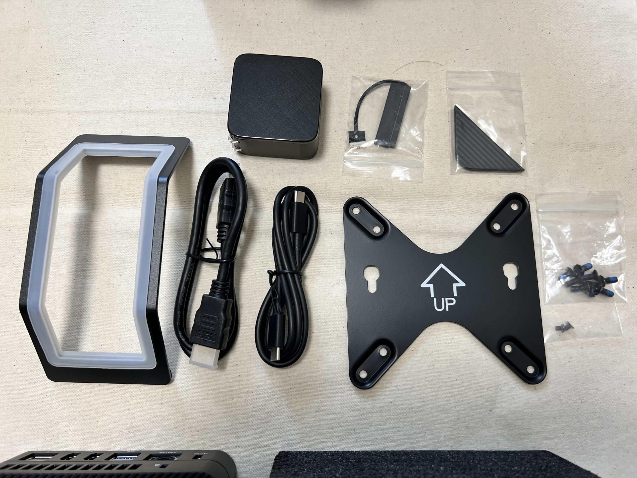 箱の底のほうには、説明書、ACアダプター、USB-Cケーブル、HDMIケーブル、本体スタンド、ディスプレイの裏側に本体を取り付ける金具 など入っていました。