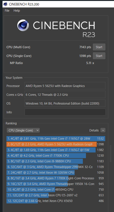 Minisforum UM560の『シングルコアの結果が1398pts』とかなりいい結果がでました。SurfacePro(第5世代)の『シングルコアが711pts』で『マルチコアが1353pts』ということで、UM560のシングルコアの成績はSurfaceProマルチコアの成績より高い数値がでていますので、すごい性能差ですね。ベンチマークをスタートさせた瞬間からグラフィック表示速度のスピードの違いが歴然でMinisfoerum UM560の処理能力が高いことが確認できました。